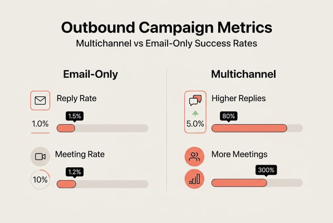 | Metric | Email Only | Multichannel | | --- | --- | | Reply Rate | 5-12% | 12-18% | | Meeting Rate | 1-3% | 3-6% | | Cost Per Meeting | $500-700 | $150-400 | | Touches Required | 3-5 | 5-12 |