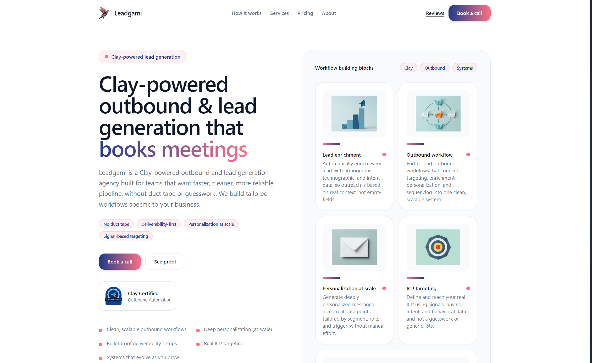Leadgami automates the heavy lifting while preserving genuine personalization. We define your ideal customer profile, identify high intent signals, and use Clay to source, enrich, and score leads based on real fit. Every message gets personalized using actual context about the prospect and their company, then executed across email and LinkedIn with deliverability managed from day one. Human SDRs handle replies, and we optimize your system weekly based on performance data. The result is a structured outbound engine that consistently generates qualified conversations and booked meetings. Whether you want us to run your outreach end to end or design tailored workflows your team can own internally, we help you implement the RIC framework at scale without sacrificing quality.